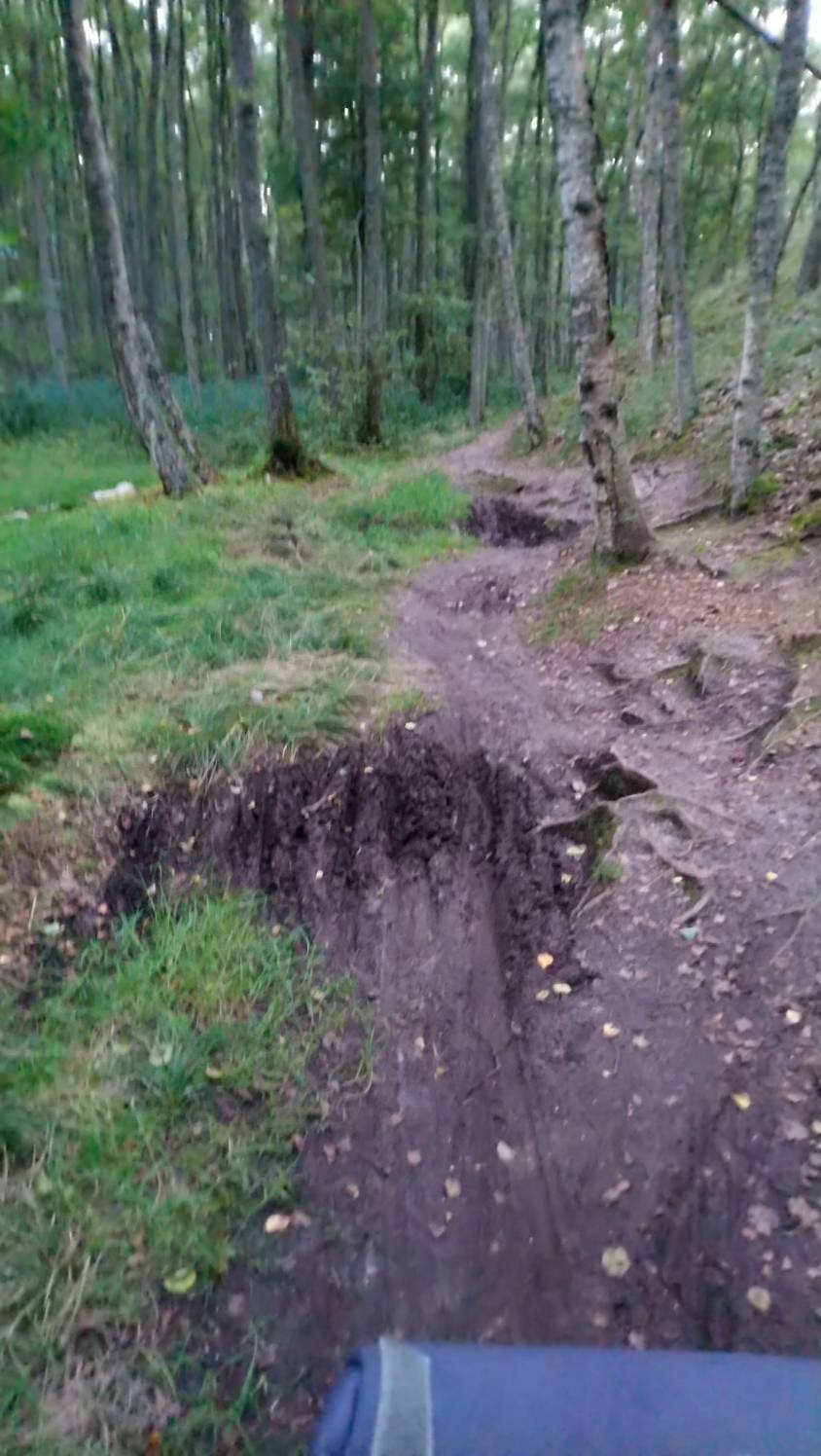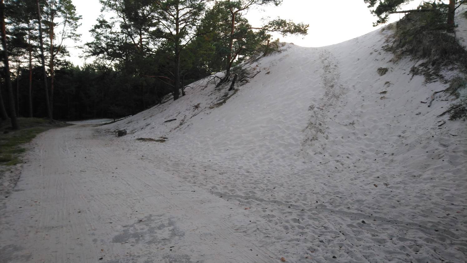 Nach einer kurzen Trinkpause gegen halbacht in einem kleinen Ort mit Saison-Fastfoodrestaurants wähnte ich mich noch pünktlich im Hotel einzuchecken. Ich hatte 19-20 Uhr als Ankunftszeit angegeben. Ich wechselte die Sonnenbrille gegen die für ohne Sonne und trat in die Pedalen. Hinter einer Wegbiegung lag ein riesiger Berg Kalk. Ich dachte an Kalk, weil der Megahaufen so hell war. Bei näherem Hinsehen war es weißer, feiner Sand. Erste Ausläufer der berühmten Wanderdünen von Leba. – Im Schatten der Dünen arbeitete ich mich weiter in den Wald vor, Leba in greifbarer Nähe. Der Weg wurde immer wilder, schmaler, ich blieb immer wieder im Sand stecken. Dann lagen Bäume quer über dem Pfad. Ich musste das Rad immer wieder schieben und über Hindernisse tragen. Vor allem machten die vielen Baumwurzeln das Fahren zu einer holprigen Angelegenheit. Der Helm schützte mich vor Geäst von oben, das mir immer mal wieder entgegenpeitschte. Inzwischen war es dunkel geworden.