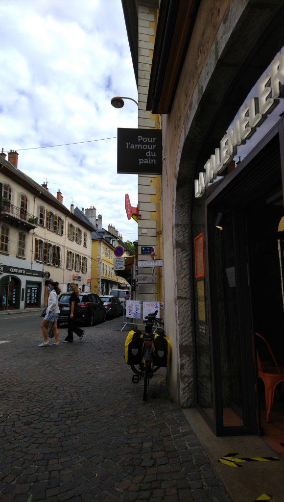 Ich musste heute morgen nochmal den Schlauch vom Vorderrad wechseln. Der Ersatzschlauch, gekauft in Neu-Ulm bei der Donau-Radtour, hatte ein Loch. Vielleicht habe ich das beim Einbauen selbst verursacht. Das Frühstück sollte auf dem „chapon fin“ serviert werden, so ein Zettel an der Eingangstür. Das Lokal der Herberge im Erdgeschoss war geschlossen. Keiner da, um zu fragen. Da es Kaffee im Zimmer gab beschloss ich, in der Altstadt zu frühstücken. Ich kehrte in einer Bäckerei ein, aus deren Backstube es ganz herrlich duftete. Da mir die Berge bevorstanden, frühstückte ich einen ziemlich großen Keks mit Nutellafüllung, für die schnell verfügbare Energie, einen Croissant, weil ich in Frankreich bin und ein Baguettebrötchen mit Schafskäse. Ich glaube, es war dann schon nach 11 Uhr, als ich schließlich aufbrach.