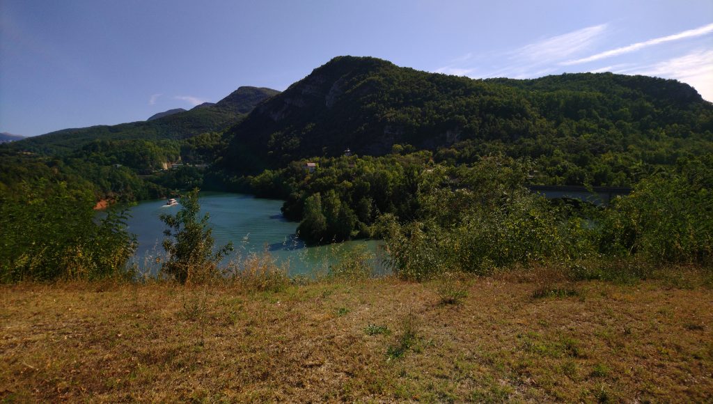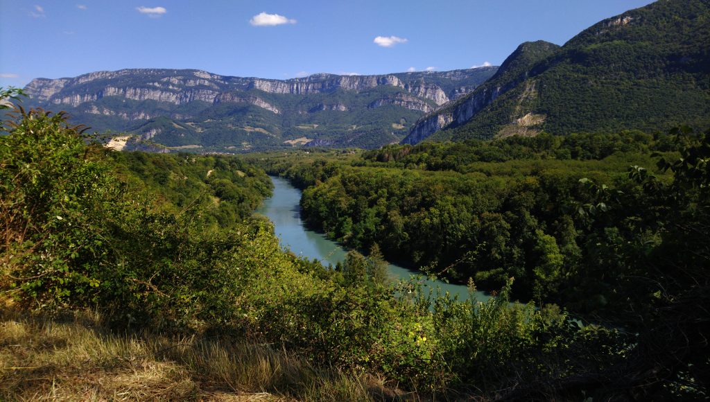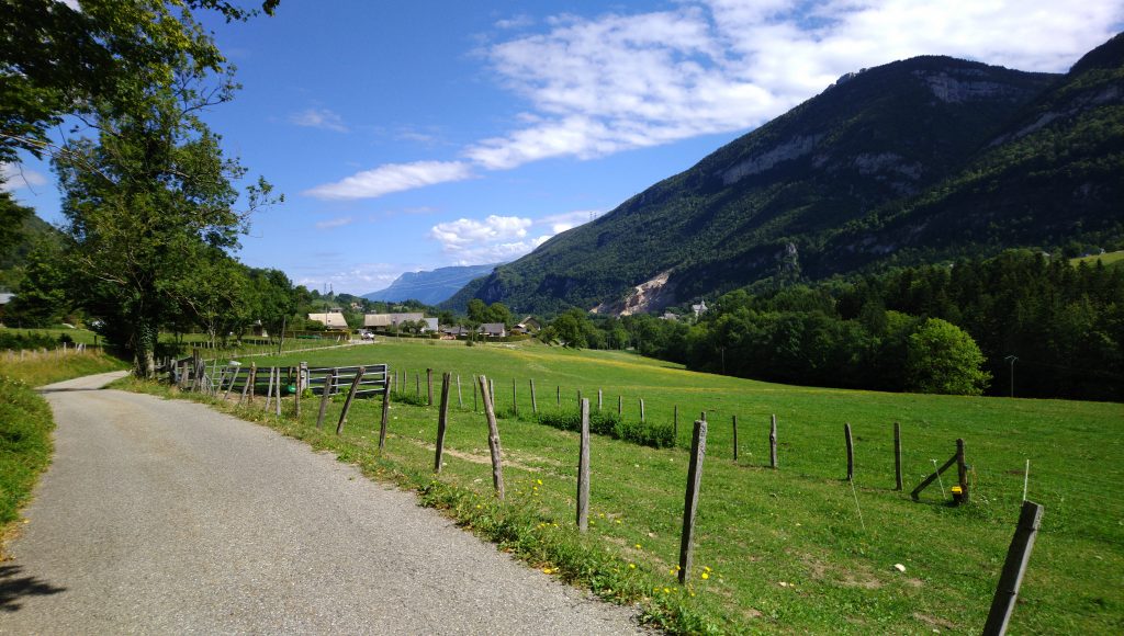 Ich arbeitete mich bei moderater Steigung langsam in den Berg hinein. Mal blieb ich auf der Landstraße Richtung Grenoble im Tal, mal führte mich die Route auf gut asphaltierte Nebenstraßen weiter oben. Auf der linken Seite, also im Westen, ragten die Berge bis auf 2.000 Meter auf. Viele Baumgruppen schimmerten in einem frischen Grün. Von bräunlichen Spätsommerfarben oder von abgestorbenen Bäumen, die unter Trockenheit leiden, wie das im Südschwarzwald der Fall war, war hier nichts zu sehen. Höher als 700 Meter musste ich nicht klettern und hielt immer wieder inne, um zu schauen und Fotos zu machen.