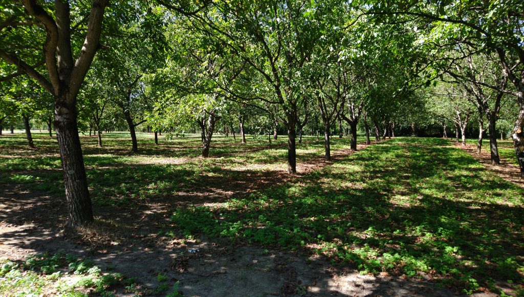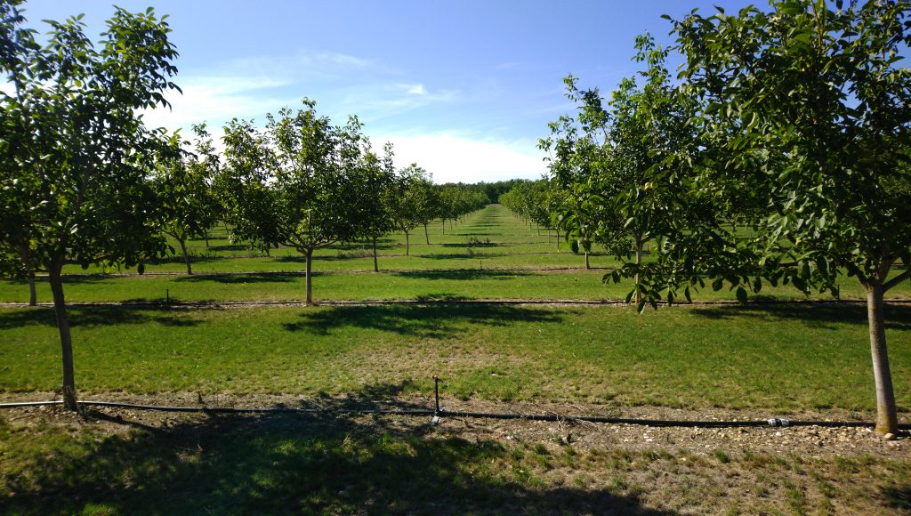 Bei Les Echelles ging es durch einen Tunnel steil hinunter ins Departement de l’Isère. Ich hatte noch weitere Bergarbeit vor mir. Auf dem 588 Meter hohen Sattel musste ich mich mit Sonnencrème einreiben. Die Wolken hatten sich verzogen, ich hatte weniger Schatten und die Strahlung unseres Zentralgestirns hatte zugenommen. Bei Voreppe erreichte ich die Isère, die ich bin kurz vor dem Ziel nicht mehr verließ. Auf dem sehr gut ausgebauten Radweg waren alle möglichen Radler unterwegs. Meine Wasservorräte gingen zu Ende. Es gab zwar eine Radtourenraststätte, aber keine Brunnen und keine Ortsdurchfahrten. Bald führte mich die Route hinauf auf kleine Nebenstraßen oder asphaltierte Wirtschaftswege, von denen ich tief ins Tal der Isère schauen konnte, Canyon würden es die Amerikaner wohl nennen. Ich kam durch etliche Walnussbaumplantagen, mal bewässert, mal nicht bewässert. Die Grenobler Walnüsse haben wohl eine geschützte Herkunftsbezeichnung. Stand irgendwo auf einem Schild. – Ich trank das letzte Wasser und überlegte, an einer Nuss-Bewässerungsanlage meine Flaschen zu füllen oder auf den entlegenen Gehöften Bauern zu suchen. Bei La Sône fand ich schließlich einen Brunnen.