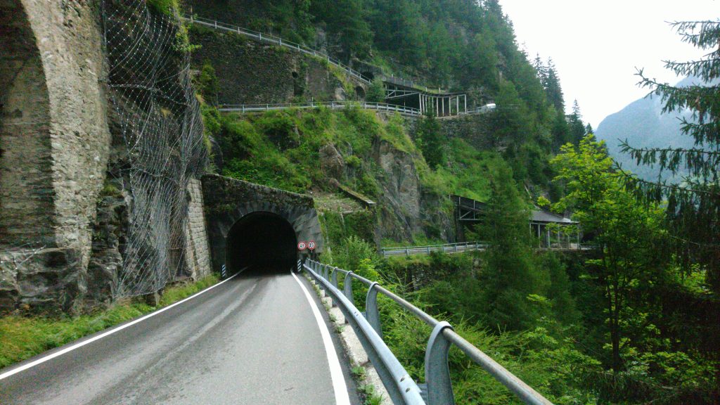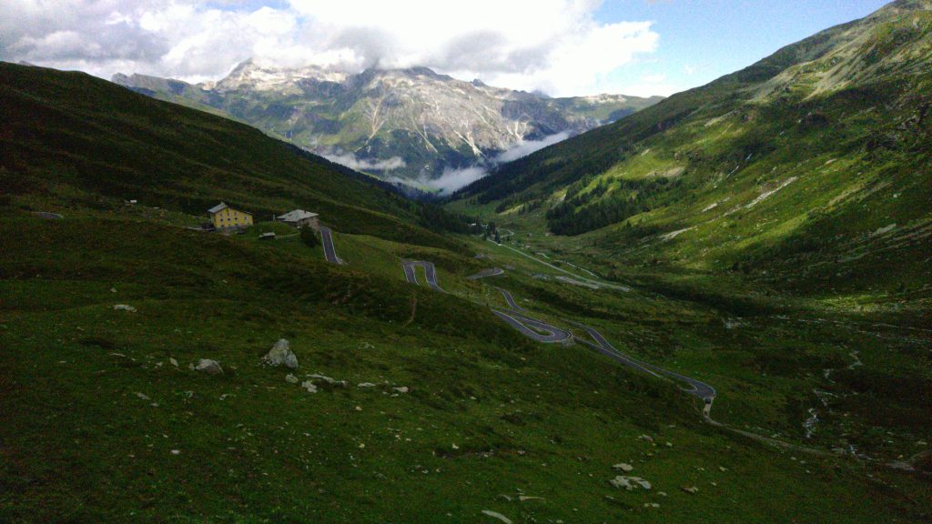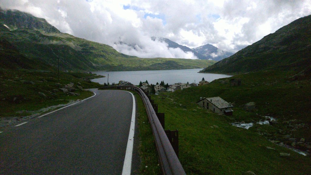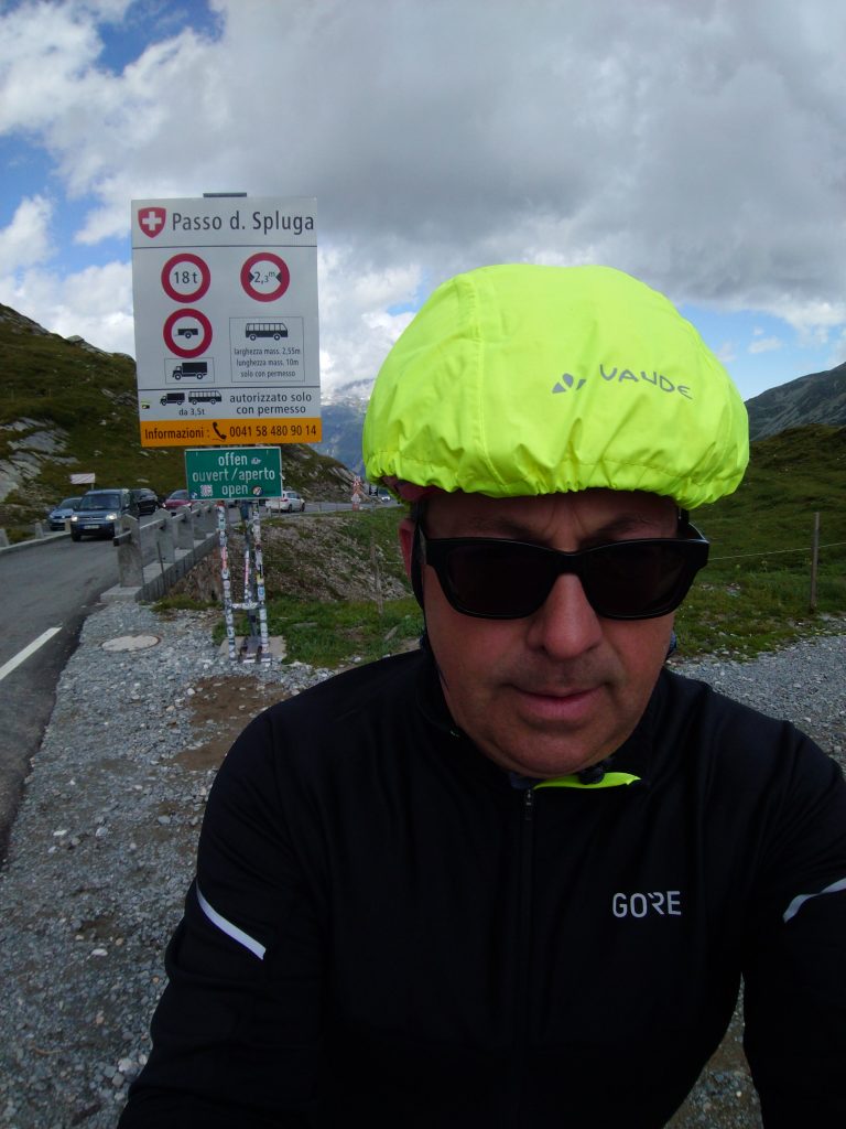 Das war der Tag der Gegensätze, aber das war ja auch klar. Am Morgen frohlockte ich beim Frühstück ob des guten Wetters: Sonnenschein am Hinterrheinsee schien die Sonne. Als ich meine Sachen packte, schüttete es schon wieder. Ich schaute mir das Regenradar an und war beruhigt: Ein runder Wasserfleck über Splügen, der sich in Auflösung befand. Als ich Richtung Pass aufbrach waren die Straßen noch nass, aber der Regen hatte aufgehört. Ich entschied mich deshalb, mein neues langes, warmes Oberteil anzuziehen und die Regenjacke in der Radtasche griffbereit zu halten. Temperatur auf der Passhöhe: ca. 8 Grad.