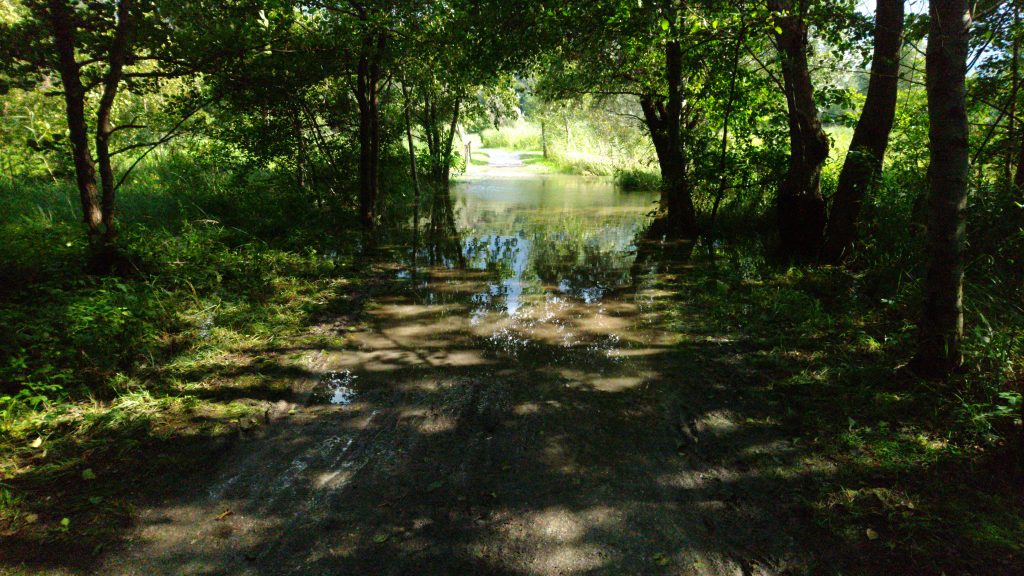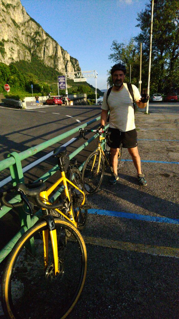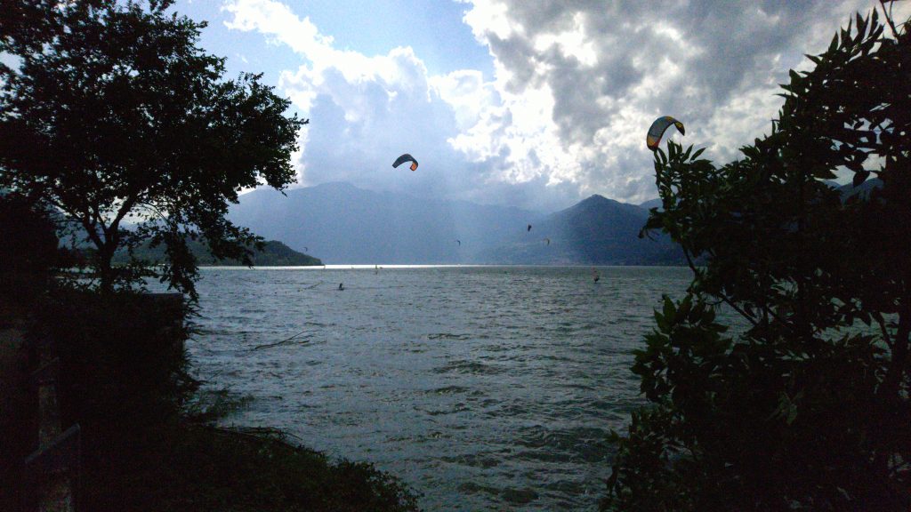 Das Navi führte mich am Comer See durch ein Feuchtgebiet, das sonst sicher trockener ist, aber nicht bei dem Regen der vergangenen Wochen. Durch matschige Pfützen sammelte ich ordentlich Dreck ein. Es war windig, ideal für die Windsurfer, die auf dem Weg unterwegs waren. Mein Weg führte mich an Badenden vorbei, durch Fußgängerzonen mit Trödelmarkt und viele Tunnels. Am Ortseingang von Lecco, meinem Ziel, hatte ich einen Platten – wieder hinten.