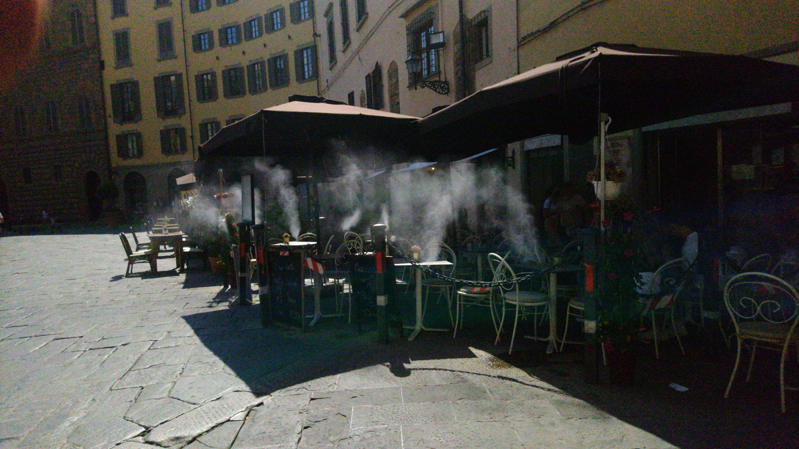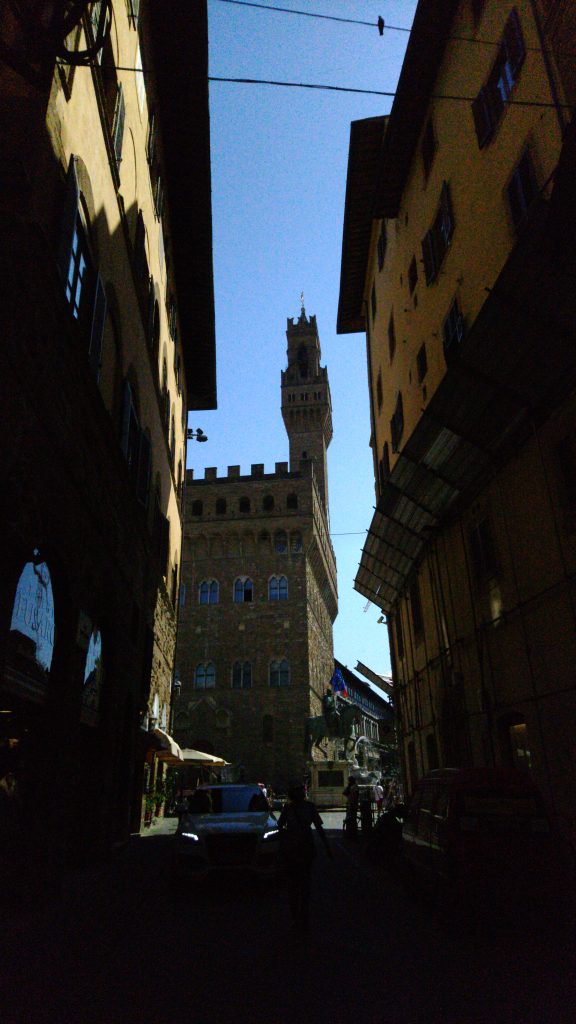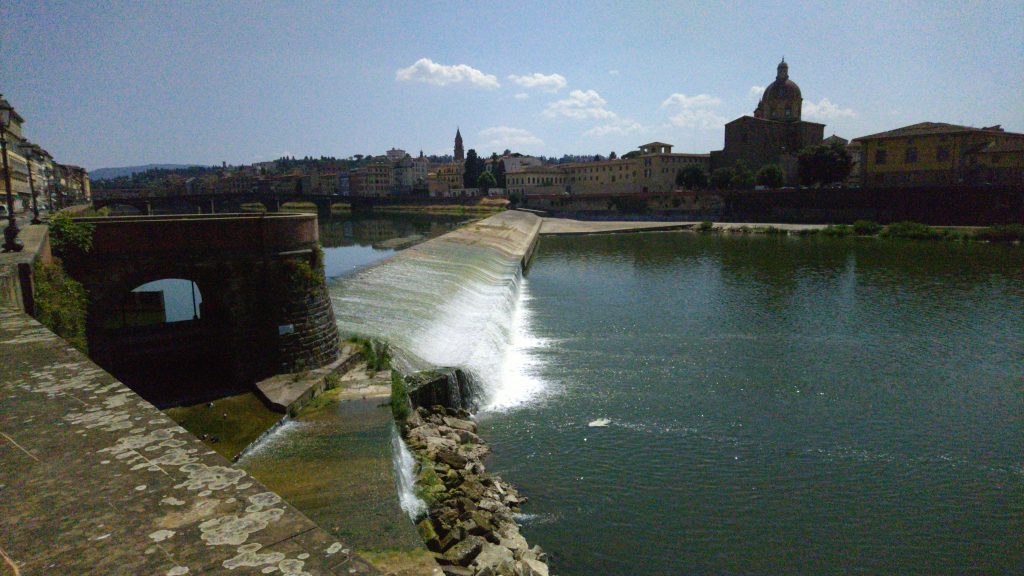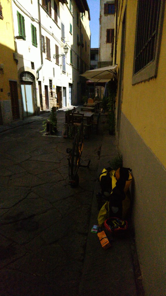 Ich steuerte zwei Radläden an, um Schläuche zu kaufen, aber am Samstag war nichts zu machen. In einer Seitengasse mit einer Kneipe mit Außenlautsprecher wechselte ich wieder den Schlauch. Ich flickte den mit dem Dorn. Um das Loch zu finden, schüttete ich Wasser aus einer Trinkflasche auf den Schlauch und verteilte das Wasser mit den Händen. Es war Ruck Zuck verdunstet. Ich fand das Loch und flickte es. Allerdings war die Stelle ungünstig geriffelt und ich war nicht sicher, ob der Flicken hält. Ich pumpte auf. Die Musik der Kneipe gefiel mir ganz gut. Ich holte mir eine Cola, die dringend nötig war und fuhr Richtung Sehenswürdigkeiten, um noch etwas von Florenz mitzunehmen. Der Reifen war schon vor der ersten Brücke wieder platt.