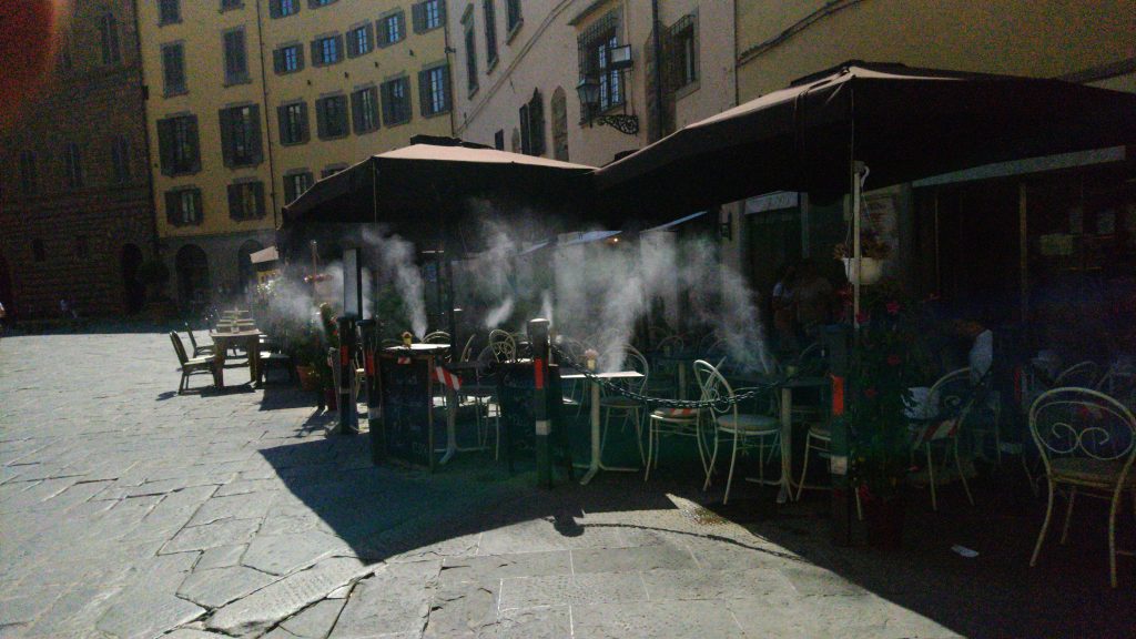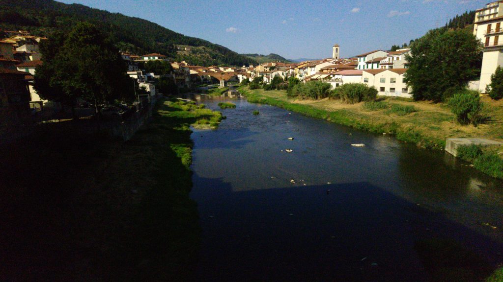 Am Standrand von Florenz piekte ich mir mit dem Vorderreifen einen Dorn auf, ein Gummi-Teil mit Stachel. Wer verliert so etwas?, dachte ich. Das Ding musste ich ja nun herausziehen. Es zischte kurz, dann: nichts. Ich fuhr weiter. Kurz vor dem Stadtzentrum gab der Reifen auf. Ich wechselte den Schlauch. Mit dem Abziehen des Reifens hatte ich schon etwas Mühe. Ihn aber wieder aufzuziehen war ein ziemliches Gezerre. Das Aufpumpen war auch nicht viel besser. Beim Abdrehen meines Pumpengewindes drehte sich das Innenteil des Prestaventils mit heraus und die Luft war wieder raus. Ich drehte also das Innenventil wieder rein, so fest es mit den Fingern ging. Eine Zange habe ich nicht dabei. Das Aufpumpen funktionierte. Ich verbrauchte in der Mittagshitze meinen Trinkproviant und fuhr weiter. An der nächsten Brücke war das Rad wieder platt. Ich schob bis zur nächsten Eisdiele und trank erst einmal wieder Wasser aus dem Kühlschrank. Die Temperaturen stiegen bis zum Nachmittag auf 39 Grad.