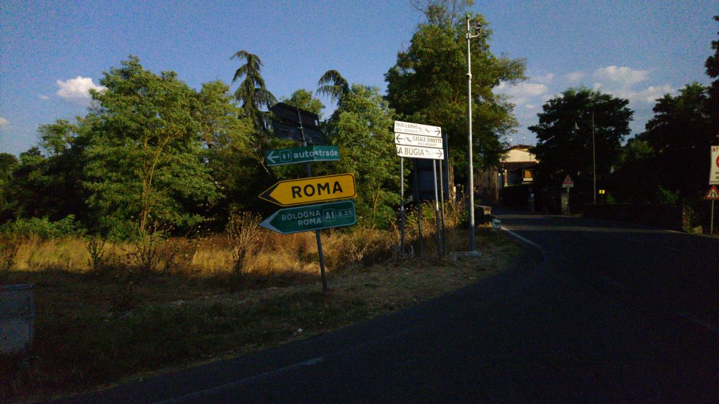 Südlich von Arezzo hatte ich bei zwei direkt hintereinander verlaufenden Kreisverkehren mit einer Menge an abführenden Straßen, darunter auch ein Abzweig zur Autobahn, etwas Schwierigkeiten, die richtige Straße zu finden. Das wäre mir auch bei Sonnenschein so gegangen. Klebrig vom Schweiß und Dreck des Tages kam ich im Hotel an.
