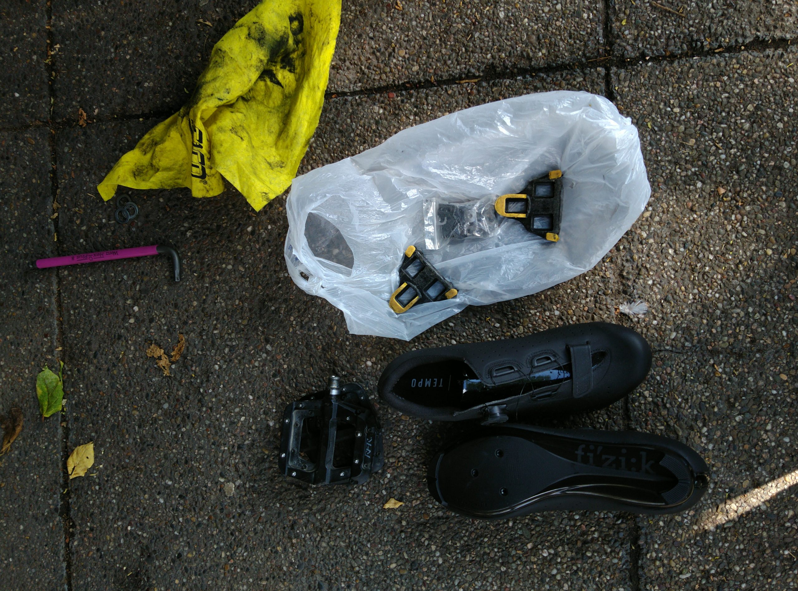 Ich hatte mir schon im Mai neue Radschuhe für die Klickpedale besorgt. Da ich mit der Zeit immer recht knapp dran war, kamen sie für Touren nach Nürnberg und Leipzig im Frühjahr und eine größere Südwestschleife (Schwarzwald, Elsass, Mosel, Mittelrhein) nicht zum Einsatz. Dabei hatte Kollege Jens gebrauchte Pedale und Cleats mitgebracht.