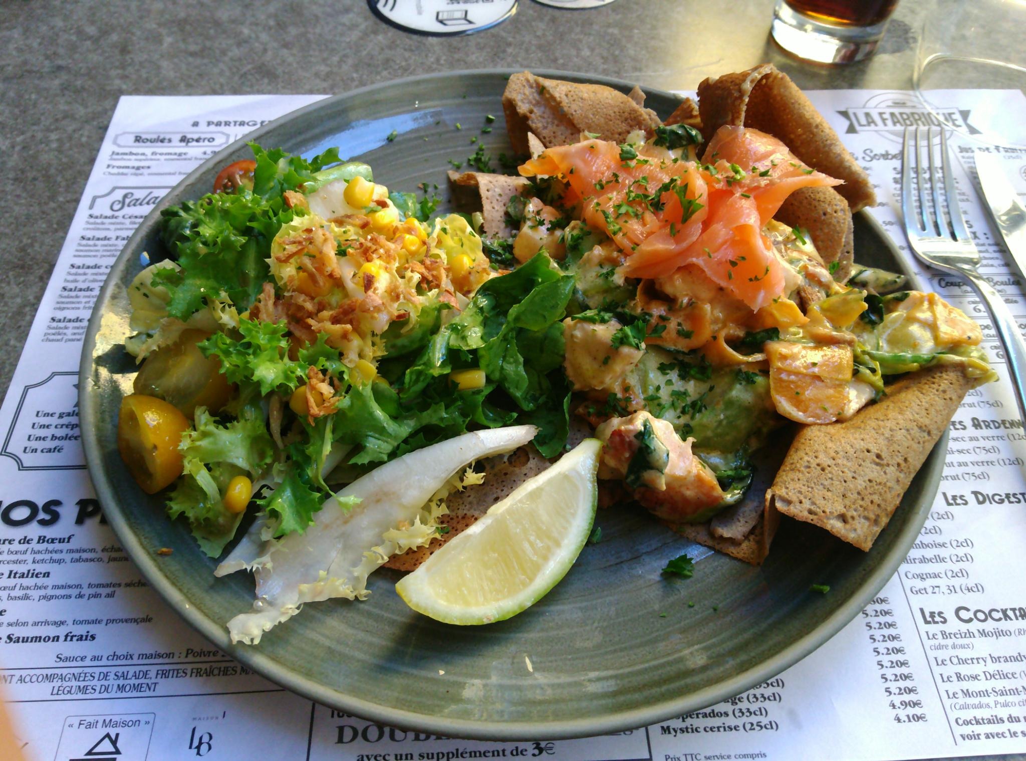 Bei der Suche nach Restaurants fiel mir ein, dass mein Mobilfunkgerät möglicherweise neu gestartet werden muss, da angeblich keine Internetverbindung möglich sei. Auch das Hilfsprogramm für den Neustart der Netzverbindungen führt nicht zum Erfolg. Und ich hatte mich schon gewundert, warum die Tour heute vom Wahoo-Navi nicht mit Komoot synchronisiert hat. Ein Problem mit meinem alternativen Betriebssystem Sailfish. Nachdem das nun geklärt war, konnte ich auch das französische Wörterbuch aktivieren. Mein DDR-Französisch reicht für die Speisekarte nämlich nicht. – Was waren nochmal „Galettes“? Aha, das ist ein dünnes Fladenbrot. „Wie Injeera in Äthiopien“, meinte Burkhard. Ja, nur nicht so weich und nicht säuerlich. Die Karte verrät, dass die Galettes aus „Schwarzem Weizen“ hergestellt wird und eine Option ist die Zubereitungsart „Tagliatelle“. Uns sprach beide noch das Zauberwort „Saumon“ an, „Lachs“. Die Julienne aus feinen Gemüsestreifen mit einer Crème nehmen wir natürlich auch noch mit. Nachdem das Essen nun entschlüsselt war, alkoholfreies Bier Fehlanzeige, warteten wir eine ganze Weile. Ich erzählte Burkhard von unserem (Jens und meinem) Abendessen in Northeim, bei unserer Tour nach Hannover, als wir bei trockener Kehle ewig auf das kühle Bier und das Essen warteten. Da finde ich die Kultur sehr angenehm, wenn man schon einmal einen Gruß aus der Küche bekommt oder das Wasser einfach standardmäßig auf dem Tisch steht – wie in der Mittelmeerregion häufig anzutreffen. Das Essen ließ zum Glück nicht so lange wie in Northeim auf sich warten und war ganz ausgezeichnet.