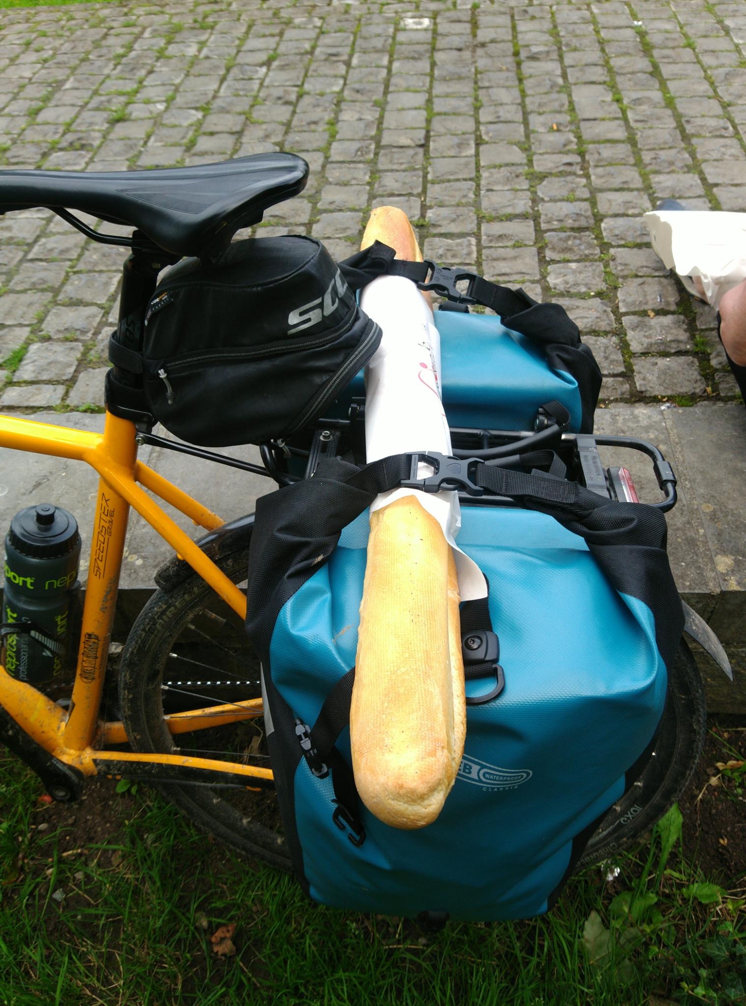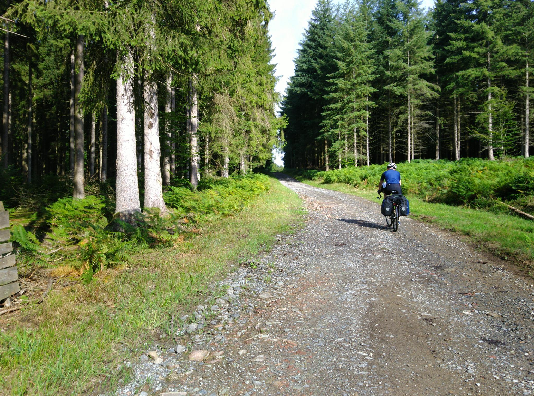 Um 9:15 Uhr saßen wir im Sattel und kurbelten uns aus dem Tal der L’Homme wieder hinauf auf das Ardennen-Plateau. An einem steilen Anstieg, der aus einem Dorf in den Wald führte, rief Burkhard hinter mir. Ich stoppte. Er schob das Rad heran und sagte: „Ich muss den Schlauch hinten wechseln“. Und tatsächlich, Luft war entwichen, aber noch kein Plattfuß. Beim Schlauch-Wechsel fand er einen dünnen Draht, der sich durch den Mantel hindurchgebohrt hatte. Dank Steckachse war das Hinterrad schnell wieder eingebaut und wir konnten weiterkurbeln.