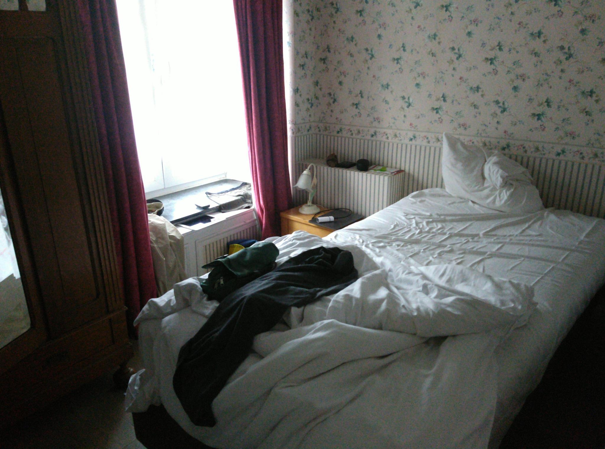Das Hotel „Bonhomme“ soll das älteste in Belgien sein. Im Passwort des WLAN-Zugangs steckt „1768“, was das Gründungsjahr ist. Zum 250. Bestehen kam der König und machte irgendwelche Sachen, auf die noch mit Fotos und Beschreibungen Bezug genommen wird. Das Hotel hat seinen Charme. Die weiße Blümchentapete im Zimmer könnte aus Jugendstilzeiten stammen. Dafür fehlen halt Steckdosen. Meine Nachttischlampe bleibt deshalb aus. Ich weiß nicht, wie das gedacht ist, habe aber auch nicht nach einem Verlängerungskabel gesucht. Wer braucht schon Nachttischlampen, wenn das Notebook Licht spendet…