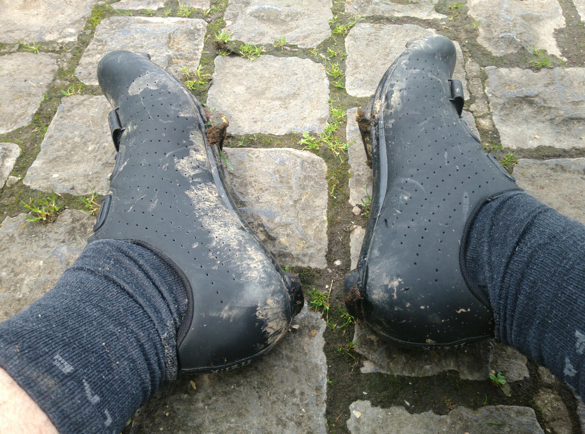 Ich hatte nicht daran gedacht, mir die Route noch einmal näher anzuschauen, sondern Komoot einfach mal machen lassen. Wir kamen auf schwer passierbare Waldwege, die vom starken Regen in der Nacht aufgeweicht waren. Grober Schotter wechselte sich ab mit Matsch und schlammigen Pfützen. Spurrinnen von Wirtschaftsfahrzeugen erschwerten das Navigieren durch den nassen Wald. An einer Stelle kam ich so ins Schlingern, dass ich absitzen musste. Mit den Klickpedalschuhen kann man das kaum spontan machen. Es braucht ein paar Augenblicke der Planung und das kann bei solch anspruchsvollem Gelände dann auch mal zu spät sein, die Cleats bleiben in den Pedalen hängen und der Körper kann nicht mehr weg und fällt. Eine harte Landung wäre es zumindest nicht geworden, es ist alles gutgegangen. Auch an der Stelle, an der mein Hinterrad durchdrehte, weil es im Schlamm keinen Halt mehr fand. Mit noch mehr Kraft ging es dann aber weiter.