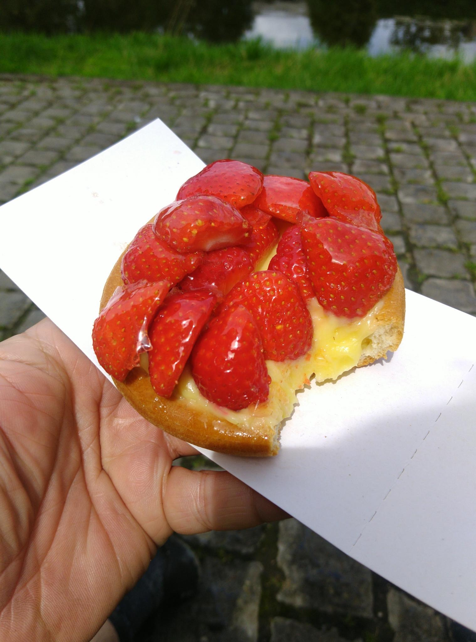 In Barvaux suchten wir uns einen Platz an der Ourthe für die Mittagspause. Ich hatte mir in der Boulangerie „New Destine“ eine Tartelette à fraise (Törtchen mit frischen Erdbeeren) und ein Baguette blanche (normales Baguette aus Weißmehl) einpacken lassen. Das dunkle Körnerbaguette wollte mir die Verkäuferin nicht überlassen. – „Décoration“.