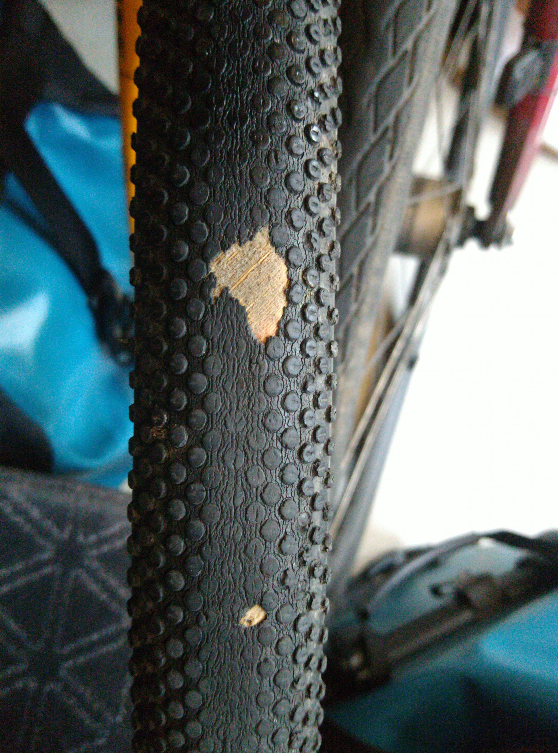 Im Zug war mir aufgefallen, dass das vermeintliche vergilbte Birkenblatt am Vorderreifen kein Birkenblatt ist, sondern Auflösungserscheinungen. Nach viereinhalb Jahren macht der Mantel schlapp.
