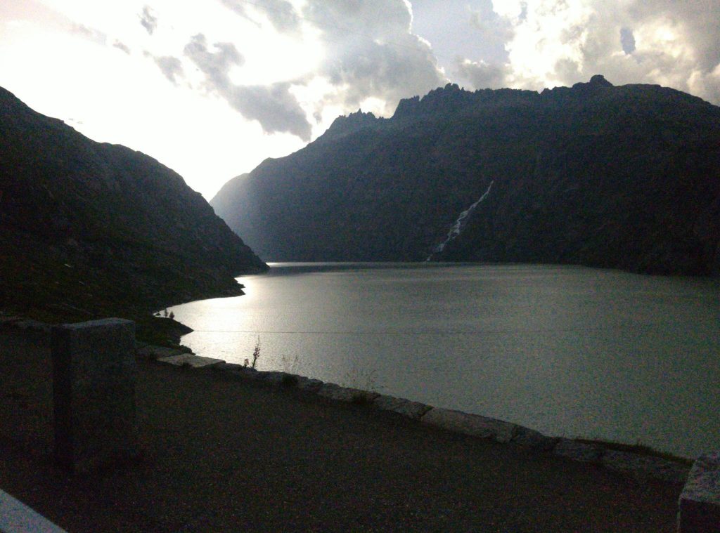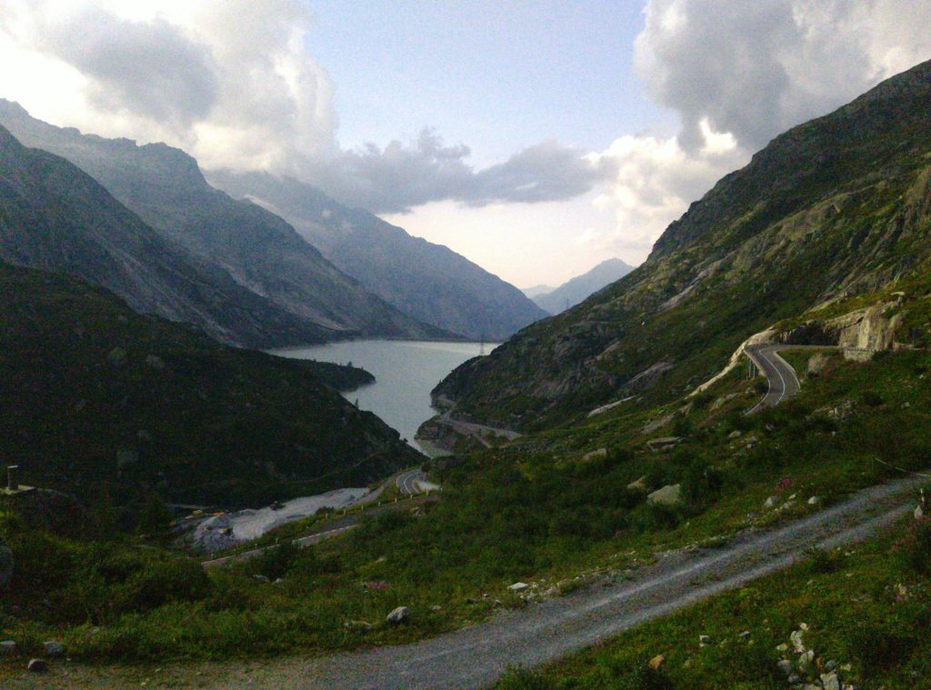 Am Grimselsee wird an einer neuen Staumauer gebaut. Oder es ist ein neues Projekt – so genau konnte man das nicht sehen. Auf der rechten Seite erstreckte sich das Massiv der Berner Alpen mit Bergen über 4.000 Metern Höhe. Bekannt ist der Große Aletschgletscher. Auf der Passhöhe war es windig. Für die Abfahrt ins Rhônetal nutzte ich meine Regenjacke als Windstopper.