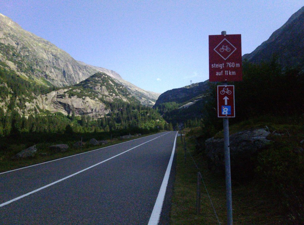 Irgendwie habe ich heute nur Rennradfahrer hinabsausen sehen. Viele grüßten und machten gute Laune. Mit mir ist niemand hinaufgeklettert. Ich hatte mich in Innertkirchen noch mit Wasser, Cola und einem isotonischen Getränk verproviantiert, insgesamt zweieinhalb Liter Flüssigkeit. Die war auch notwendig. Die ersten 900 Meter hatte ich mit der Hitze zu kämpfen. Aber nicht so extrem wie beim 20-Prozent-Berg, bei dem mir der Schweiß aus dem Gesicht auf die Fußspitzen lief. Weiter oben lief es besser – die kühlende Luft und einer meiner Zuckerriegel hatten es gebracht.