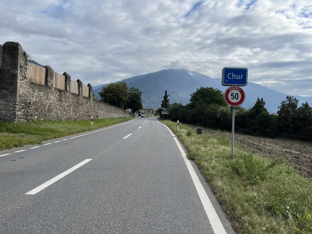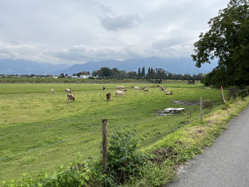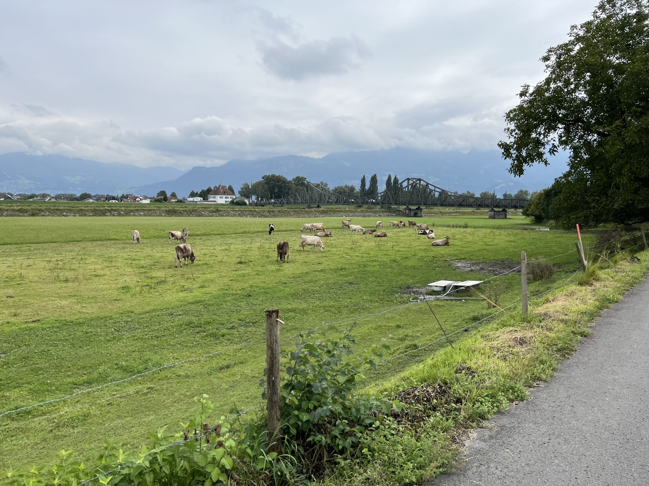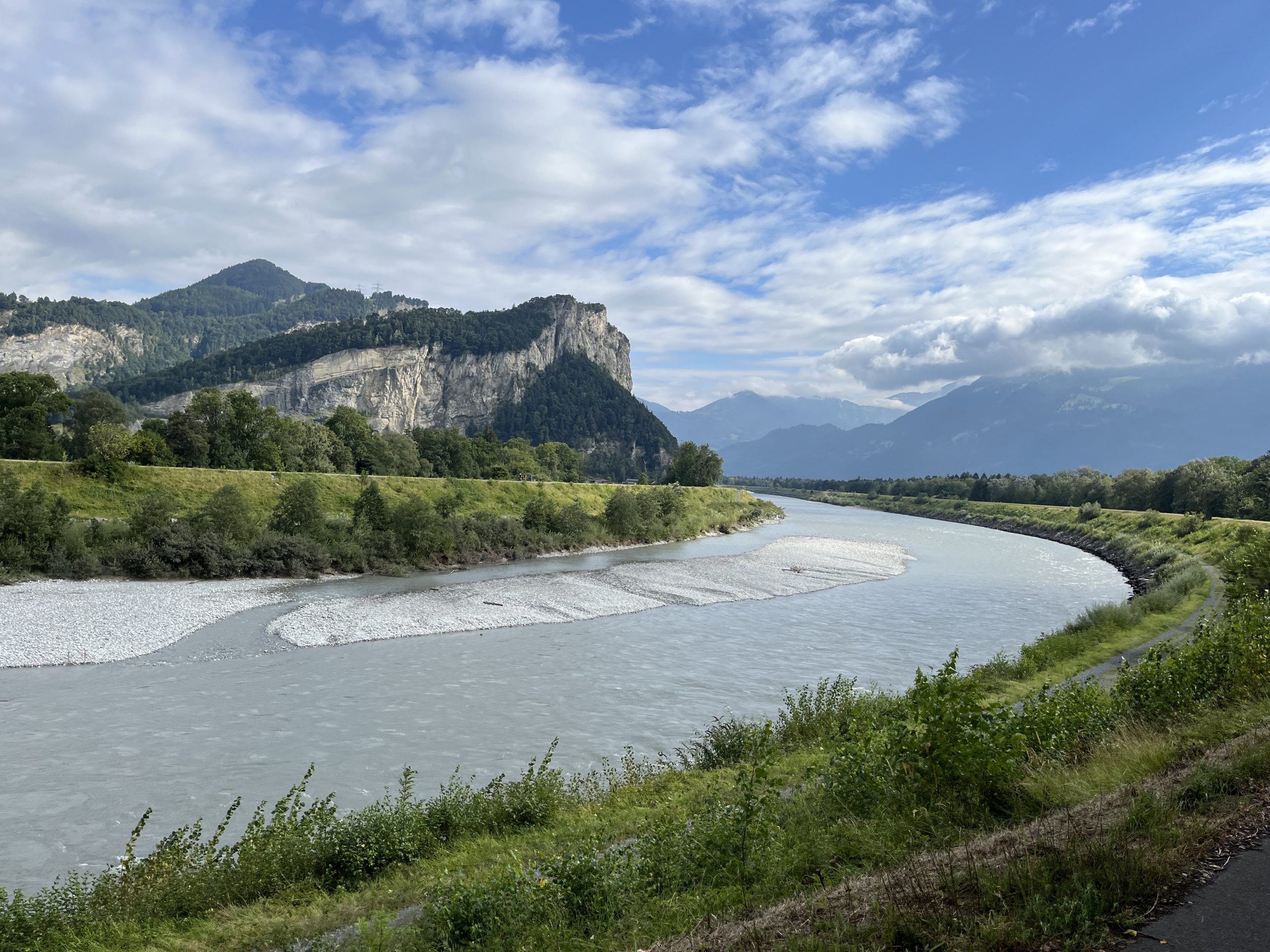 Um sechs war ich in Chur. Der Rhein ist zum Bodensee hin stark begradigt. Über weite Strecken kann man einen gut asphaltierten Radweg auf der Deichkrone fahren – eine Rennstrecke. Heute kam auch noch Rückenwind dazu.