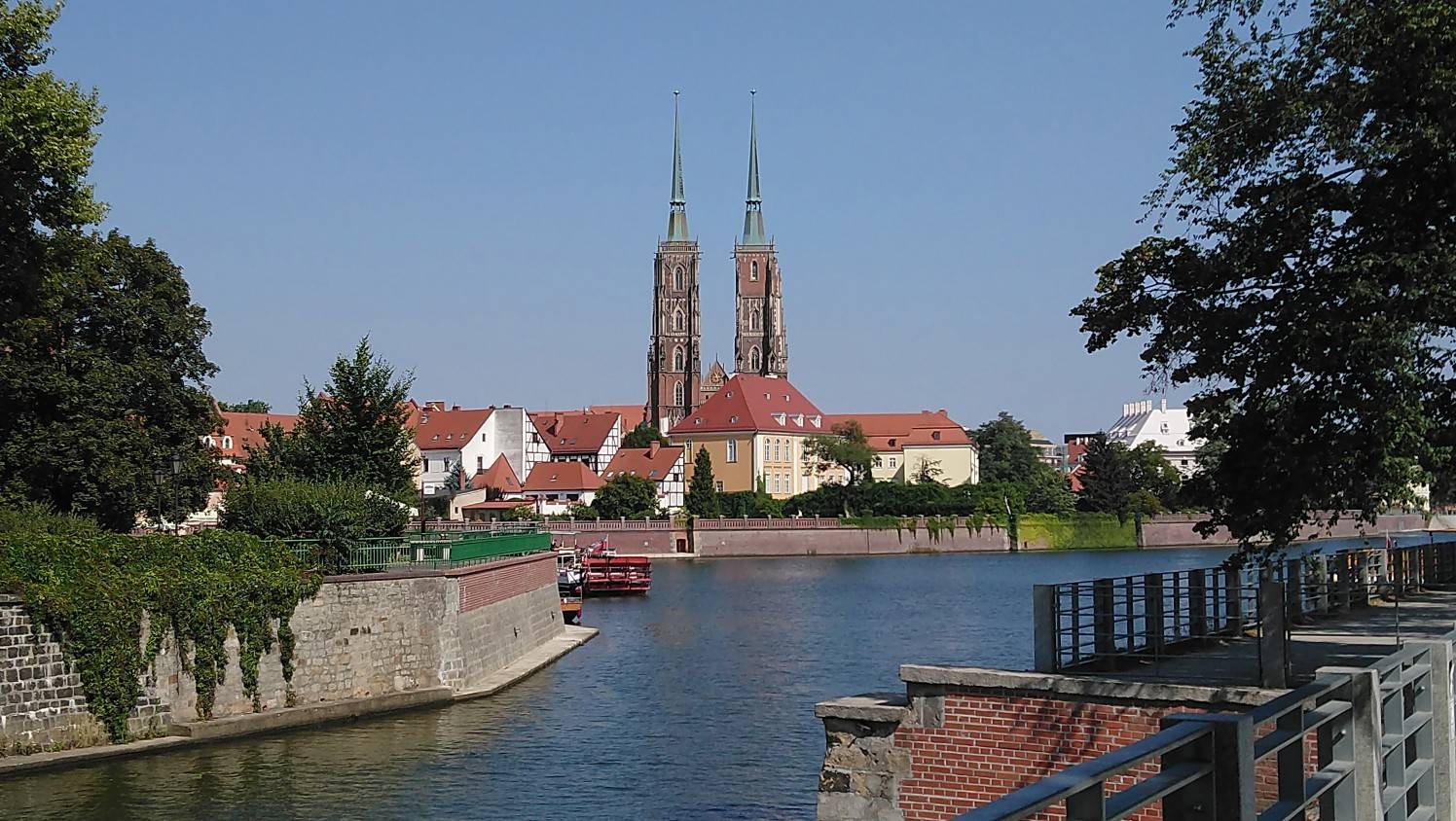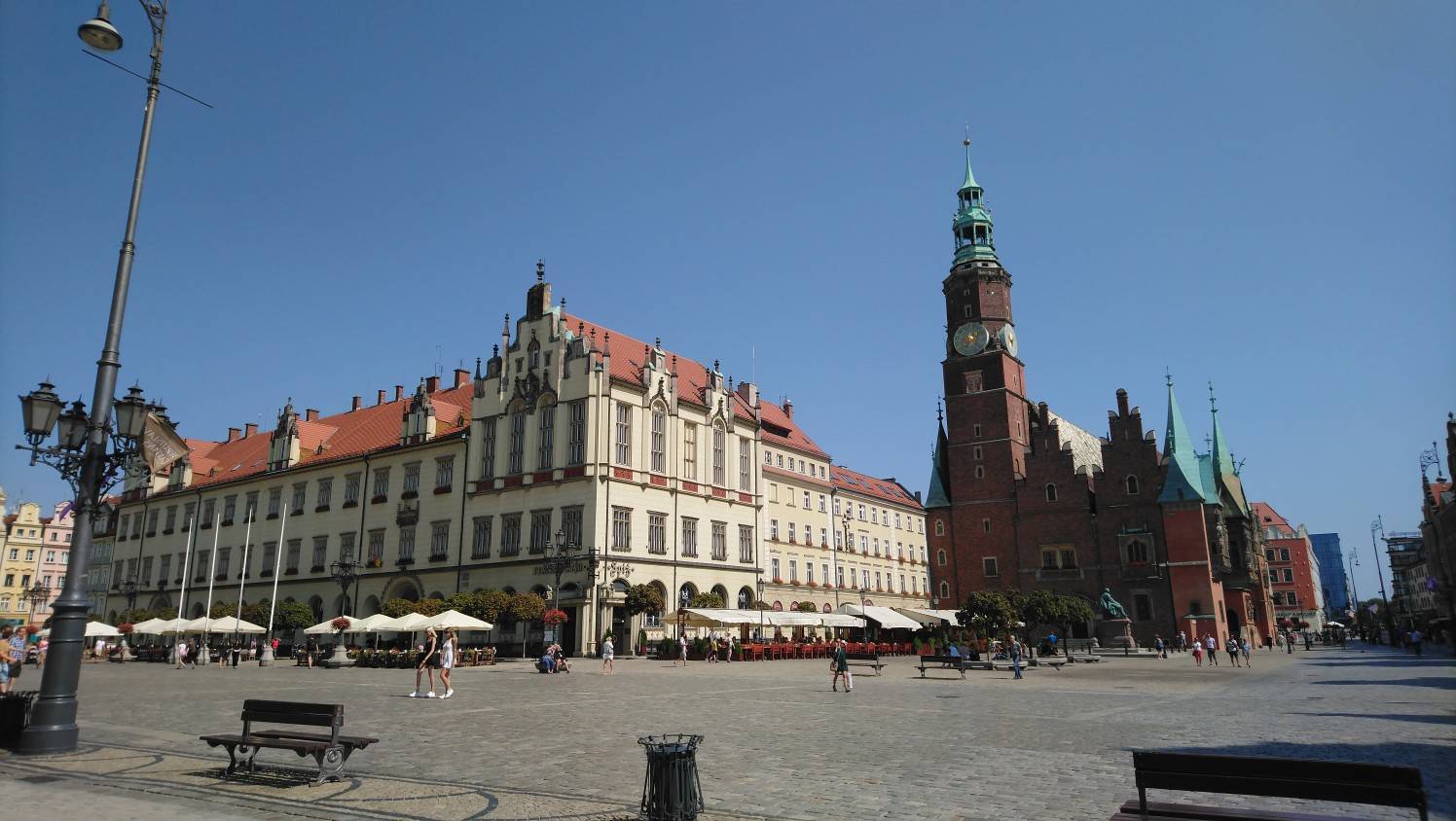 Die Mittagspause in Breslau habe ich mit bei stechender Sonne und über 31, 32 Grad im Schatten hart erarbeitet. Die Supermärkte liegen natürlich immer auf der falschen Straßenseite und so bin ich nach gefühlt endlosen Gewerbegebieten (Bosch, BASF, Fresenius, Opel, BMW, VW, DHL, UPS…), Vorstadtsiedlungen, dem Stadion, zahllosen Brücken und Ampeln zur besten Mittagszeit in der Breslauer Altstadt. Da muss erst einmal ein klimatisierter Tante-Emma-Laden für Mineralwasser herhalten. In einem Thairestaurant futtere ich Nudeln und lege mich etwas ans Oderufer. Natürlich nicht, ohne vorher den Markplatz zu bestaunen und Fotos zu machen.