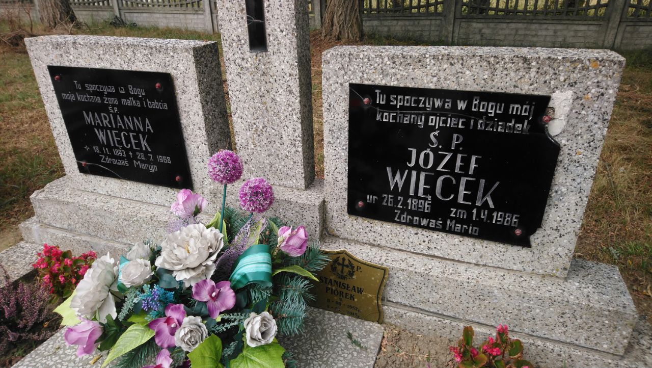 Doch die erste Station des Tages führte mich zu Großvater Antons Geburtsort Parzynów (Streuhofen). Der Ort gehört schon zu Großpolen, ist aber noch nah an Schlesien gelegen. Meine Theorie, auf dem Friedhof vielleicht noch Vorfahren zu entdecken, ging auf. Schnell entdeckte ich das Familiengrab von Jozef Wiecek (26.02.1896-01.04.1986) und Marianna Wiecek (18.11.1893-28.07.1968), zusammen mit Stanislaw Piorek (08.08.1952-01.02.2015). Der Name Piorek taucht in der Familienchronik auch öfters auf. Das Grab ist gepflegt, es wird also noch Angehörige geben. In welchem Verhältnis die Personen zu Anton Wiecek stehen, muss sich noch zeigen. Für Gespräche mit Dorfbewohnern oder die Kirchenbücher ist heute keine Zeit.