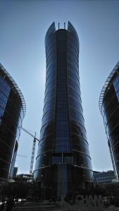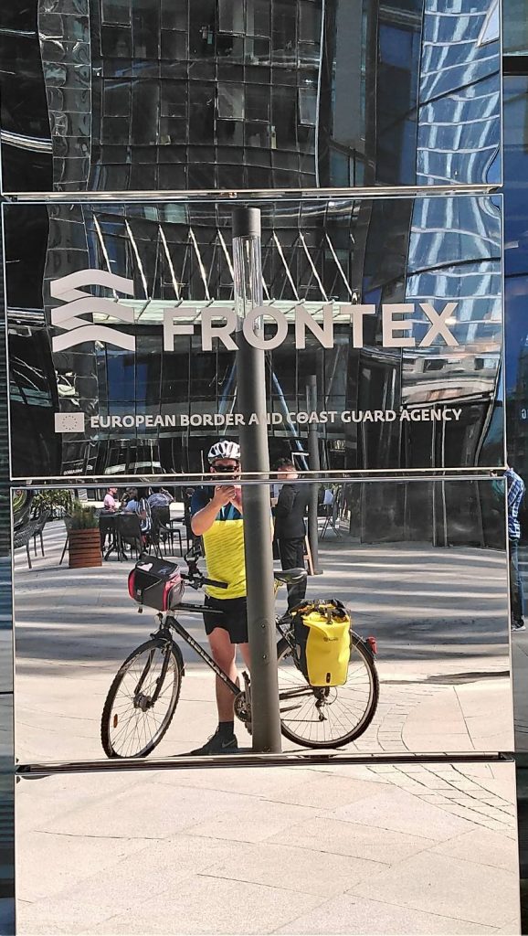 Die langsame Annäherung an eine Stadt hat etwas: man hat Zeit für Details, Zeit zum Schauen. Man sieht, wie im Falle von Warschau, die Skyline aus unterschiedlichen Winkeln, dann verschwindet sie, um schließlich größer und größer zu werden. Die Restaurant-Dichte nimmt zu und die Zahl der Menschen, die schick gekleidet sind. In der Mittagspause sitzen viele beim Bier, während die Apotheken 32 Grad im Schatten anzeigen. Schließlich steht man unter einem Tower. Ich hatte mir die EU-Behörde FRONTEX als einen Zielpunkt in Warschau ausgesucht. Was die Beamten hier hinter den Glasfassaden wohl alles machen?