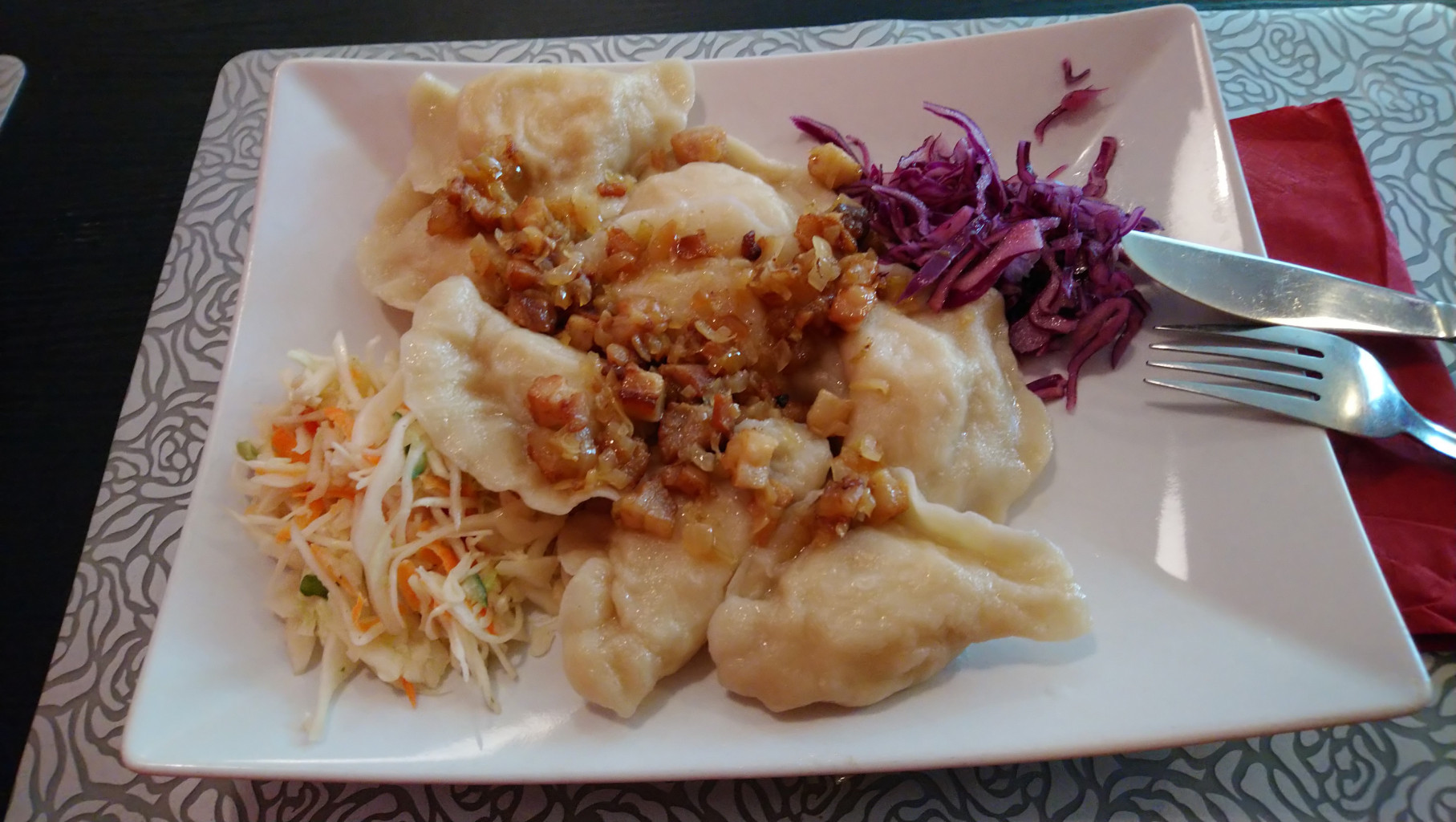 der Pirogen einverstanden. Ich erhoffte mir Kohlehydrate und die Teile wurden nach kurzer Wartezeit am Platz serviert. Ich war in einem Bistro eingekehrt, am Ende eines großen Friedhofgeländes. Draußen saß eine Gruppe und belegte alle Plätze. Mir war der Gastraum nicht nur wegen der Klimatisierung willkommen, sondern auch, um das Handy aufzuladen. Ab und zu kamen Leute in schwarzen Klamotten rein, holten sich etwas zu trinken und gingen auf’s Klo. – Die Russki Pirogi mundeten. Sie enthielten eine Füllung aus Frischkäse oder ähnlichem. Eine Verwandtschaft zu den schwäbischen Maultaschen ist unverkennbar. Das Ganze wurde mit gebratenem Schinkenspeck und rohem Kraut- und Rotkohlsalat serviert.