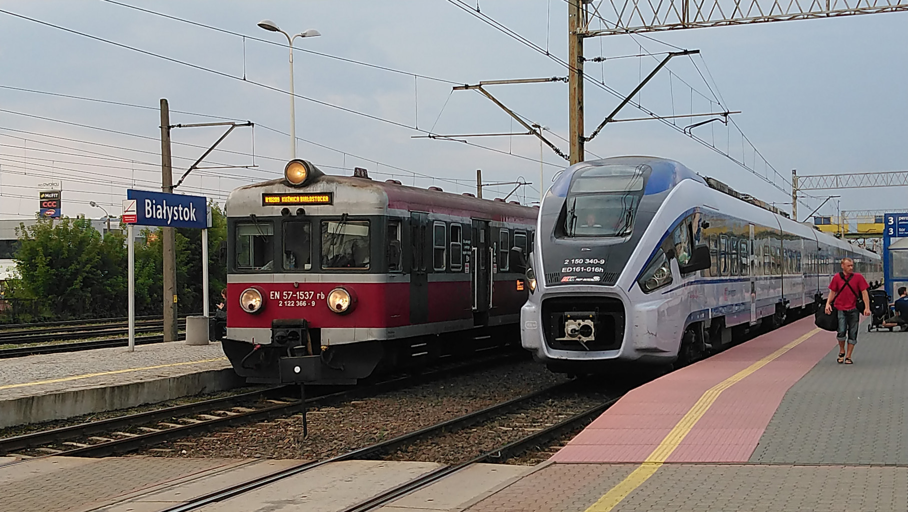Drückende Hitze, 31 Grad, dunkle Wolken, Gewitterluft: Kaum war ich nach meiner Döner-Pause an der Bahnstation angekommen, fuhr um 17:42 Uhr auch schon der Intercity nach Bialystok. Die modernen Wagen haben eine Ecke zum Aufhängen der Räder. Ein Rad hing schon in der Verankerung. Die Besitzerin hatte die gleichen gelben Radtaschen wie ich. Ich machte ihr klar, dass sie wegen mir nicht umbauen muss. So steckte ein Ende meines Rades im Radabteil, das hintere Ende steckte Richtung Ausstieg, fühlte sich aber alles stabil an. Endlich erreichte ich kurz nach halbsieben das erste Ziel meiner Reise. Im Hotel Royal stand mein Koffer mit den Partyklamotten bereit. Das Rad durfte ich freundlicherweise an der Rezeption unterbringen. Da sah ich auch schon bekannte Gesichter. Nach kurzer Begrüßung durch den Jubilar (Geburtstag hat er erst am Sonntag), der mir auch die anderen vorstellte, das Brautpaar etc., machte ich noch einen Rundgang in der Stadt, wo mich dann ein leichter Gewitterregen doch noch erwischte.